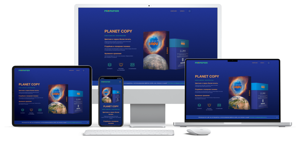 Адаптивный дизайн, верстка, программирование корпоративного веб-сайта, презентация продукции офисной бумаги Planet Copy